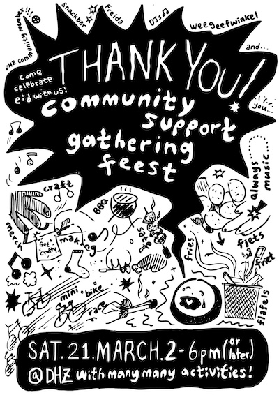 We vragen jullie nog steeds om Zaterdag 21 Maart in jullie agenda te zetten! We waren van plan een crowdfundingfeest te organiseren, maar omdat jullie ons voor waren, doen we het toch. Zie dit als een moment van steun en saamhorigheid voor de community, waarop we elkaar kunnen bedanken voor alle manieren waarop we er zijn!